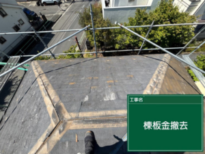 まずは、屋根の頂上部分にある古い棟板金を撤去していきます。