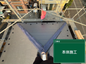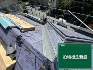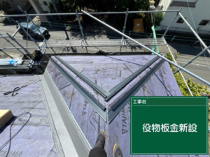 今回使用する屋根材「スーパーガルテクト」と同素材の役物板金を使用して、屋根同士がつながる面と面の境目に設置していきます。