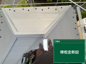 棟板金は、屋根材と屋根材の境目に設置されるため、その隙間を覆い雨水の侵入を防ぐ役割がありますが、こちらも、紫外線や雨水により塗膜が劣化しており、色が剥げ、すでに全体的に白っぽくなっていました。