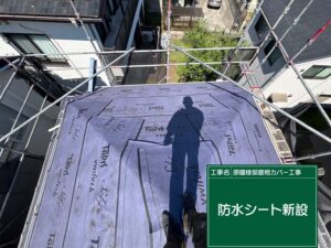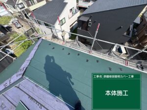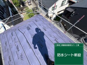 既存屋根の上から防水シート(ルーフィングシート)を敷設します。