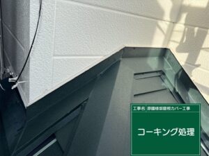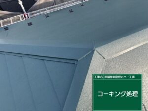 最後に大屋根や下屋の棟のジョイント部に、コーキング処理を施して完工です。