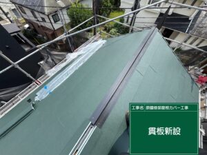 屋根材を葺き、棟の下地には樹脂材のタフモックを使用します。