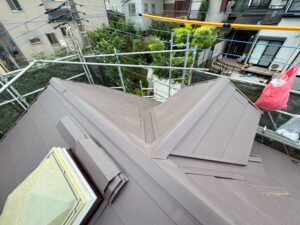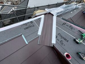 屋根の角や、つなぎ目、屋根材が途切れる隙間は、雨水が入りやすい箇所ですので、専用の役物板金で補強します。