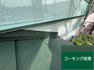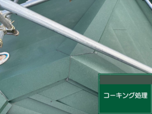 棟板金の接合部分にはしっかりとコーキング材を充填し、わずかな隙間からも雨水が入り込まないよう、防水処理を念入りにおこなっています。