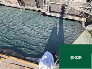 スレート屋根をご使用になられていた場合、そのまま屋根を残し、上から新しい屋根材を設置する「カバー工法」が採用されることも多いのですが、今回はお客様のご要望で、既存屋根を撤去する「葺き替え工事」をさせていただくことになりました。