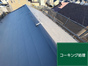 棟板金同士の接続部位にできる隙間にはしっかりとコーキング処理を行っています。