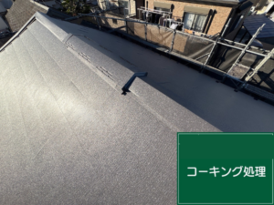 棟板金同士の接続部位にできる隙間にはしっかりとコーキング処理を行っています。
