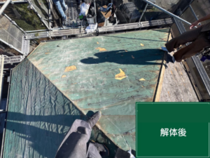 スレート屋根をご使用になられていた場合、そのまま屋根を残し、上から新しい屋根材を設置する「カバー工法」が採用されることも多いのですが、今回はお客様のご要望で、既存屋根を撤去する「葺き替え工事」をさせていただくことになりました。